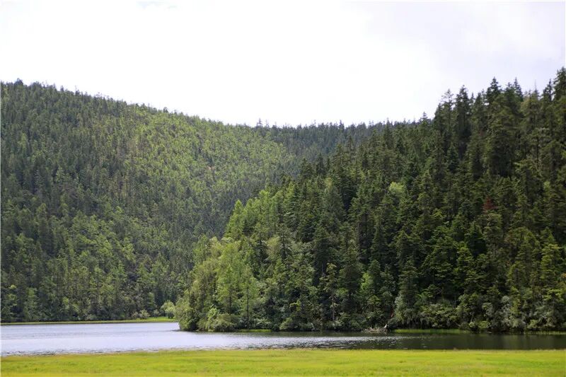 碧塔海被黛色的群山環(huán)抱,像一顆鑲嵌在群山中的綠寶石,高山臨湖,山光水色,真可謂“半湖青山半湖水”。