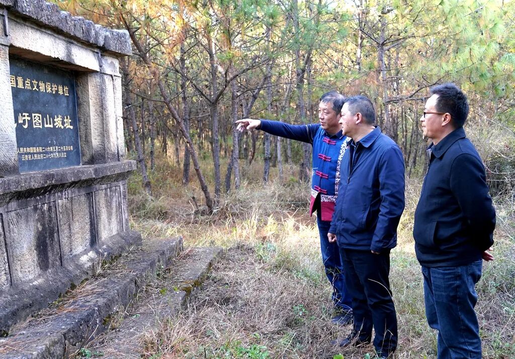 山龍 山于圖山城址是全國重點文物保護單位,史料證實該遺址為南詔國第一座都城遺址。調(diào)研時,楊國宗詳細了解遺址現(xiàn)狀、保護措施、保護規(guī)劃等情況,他強調(diào),做好山龍 山于圖山城址保護利用工作意義重大,巍山縣要科學(xué)制定保護規(guī)劃,積極爭取上級相關(guān)部門支持,有計劃地進行考古發(fā)掘工作,謀劃建設(shè)山龍 山于圖山城遺址公園,深度挖掘南詔歷史文化的根脈、文脈。要切實擔(dān)負起保護傳承歷史文化的重要責(zé)任,扎實做好歷史文化名城保護,全力抓好歷史文化名城樣板建設(shè)。