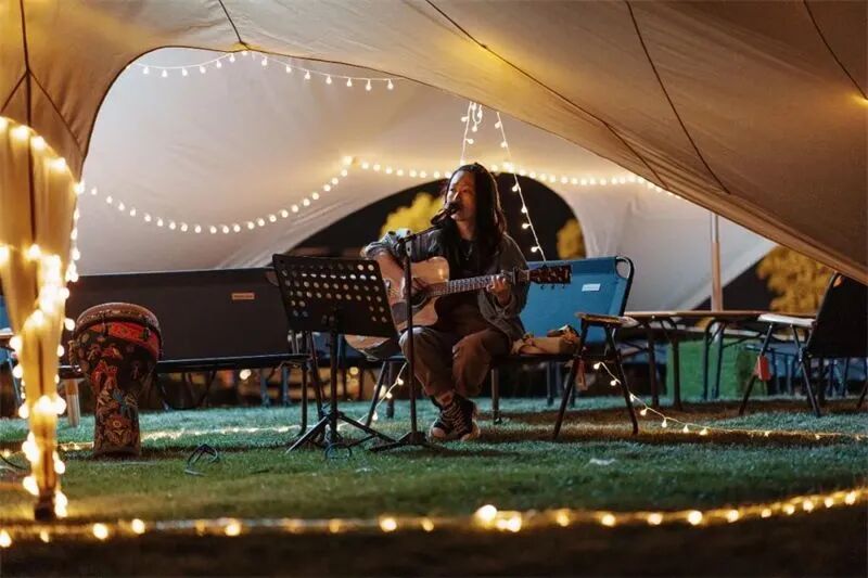白天的星河房車(chē)露營(yíng)地鳥(niǎo)語(yǔ)花香,夜晚則是滿天繁星、燈火輝煌。這里,有篝火、有音樂(lè)、有美食,還有廣闊的山野,滿足了不少人在城市繁忙生活中對(duì)浪漫、精致、自然生活的遐想和期待。草坪上、帳篷下,溫暖的營(yíng)燈伴著民謠歌手悠揚(yáng)的歌聲,正是許多人向往的“詩(shī)和遠(yuǎn)方”。在如此美妙的環(huán)境中度假,滿滿的幸福感。