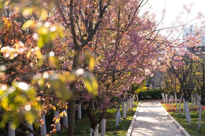 在暖洋洋的日光里,楚雄福塔公園的櫻花盛放,成為冬季最溫柔浪漫的一抹色彩。這些粉紅色的花朵,一朵挨著一朵、一串挨著一串,在藍(lán)天白云下、冬日暖陽(yáng)中,溫暖著人們的視野。