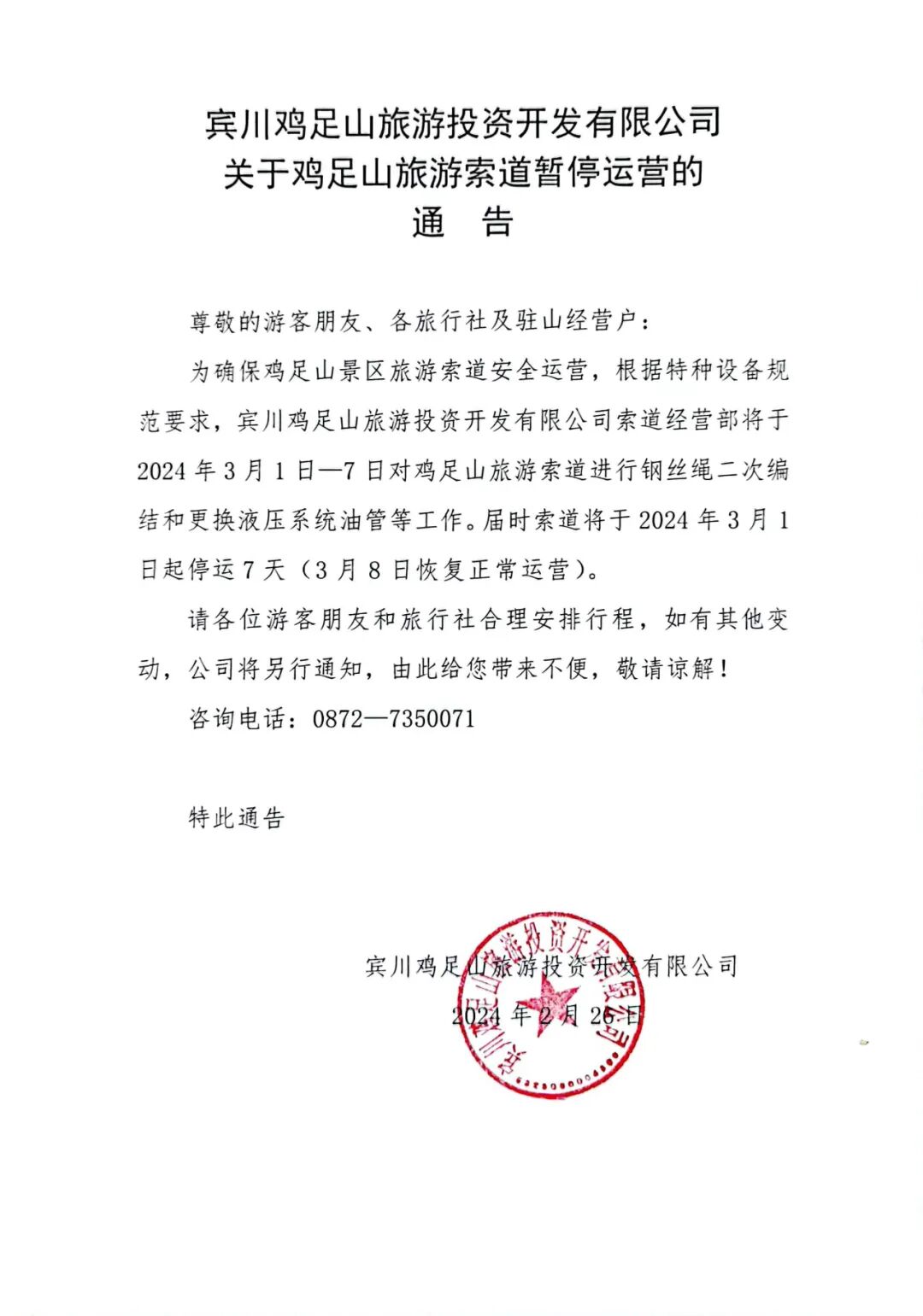 為確保雞足山景區(qū)旅游索道安全運(yùn)營,根據(jù)特種設(shè)備規(guī)范要求,賓川雞足山旅游投資開發(fā)有限公司索道經(jīng)營部將于2024年3月1日—7日對雞足山旅游索道進(jìn)行鋼絲繩二次編結(jié)和更換液壓系統(tǒng)油管等工作。屆時(shí)索道將于2024年3月1日起停運(yùn)7天(3月8日恢復(fù)正常運(yùn)營)。