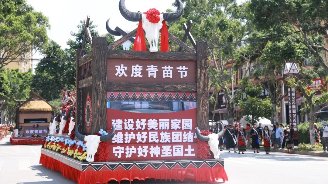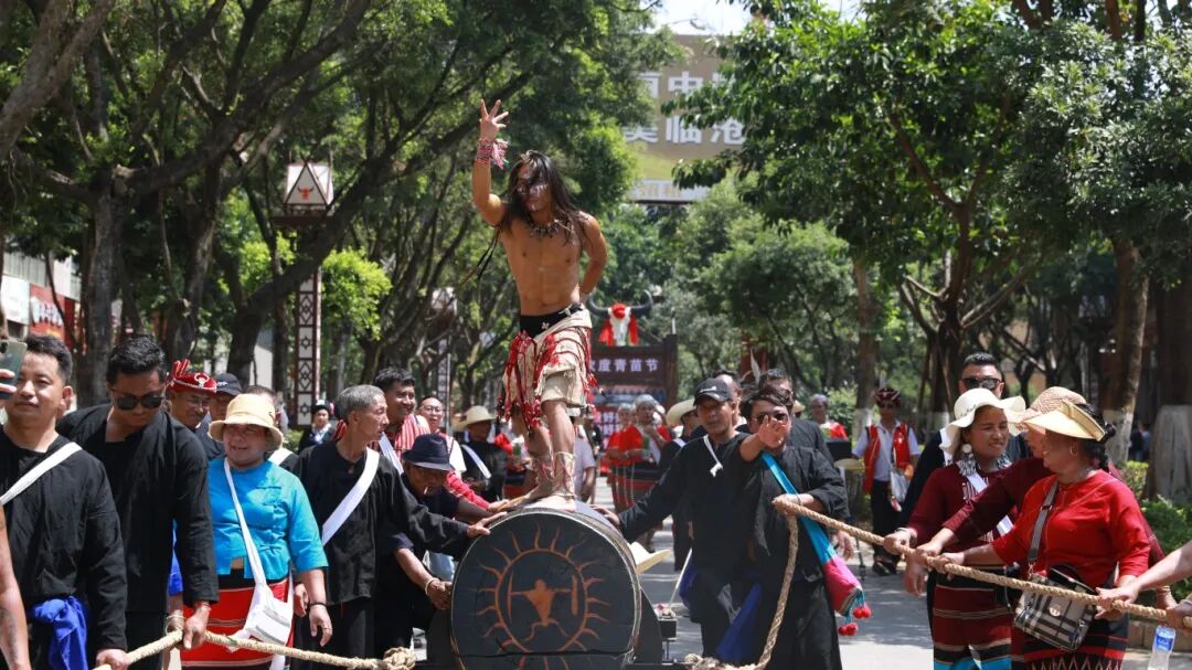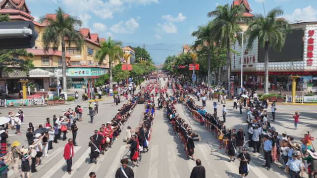 震天的木鼓聲響起,悅耳的歌聲唱起,甩起長發(fā),歡歌勁舞。身著漂亮民族服飾的各族群眾,一路歌,一路舞,一路歡聲笑語,千人齊心拉著木鼓。佤族長者高舉象征著財(cái)富、吉祥安康的牛頭走在方陣的最前面,佤族群眾手捧稻谷、玉米青苗,以舞蹈的方式展示佤族同胞們辛勤勞作、共慶豐收的新氣象。
