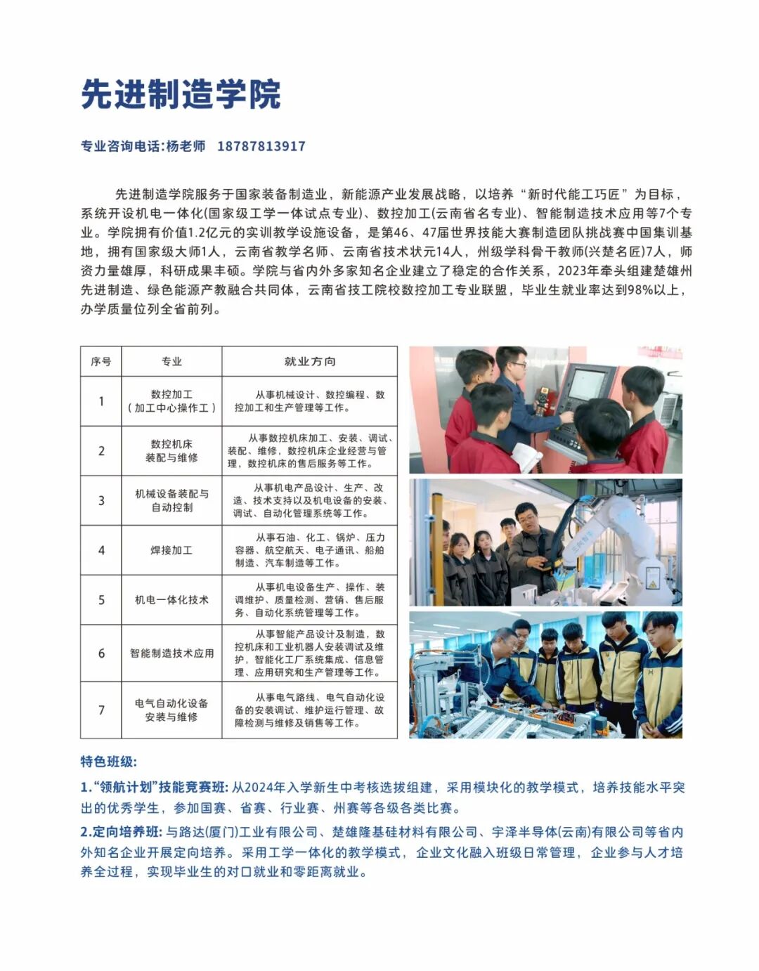 楚雄技師學(xué)院是一所集技工教育、成人教育、職業(yè)技能培訓(xùn)鑒定、公共實訓(xùn)為一體的國家公辦技工類高等職業(yè)教育院校,與云南現(xiàn)代職業(yè)技術(shù)學(xué)院一體化融合辦學(xué),素有“滇中工匠搖籃”之稱。學(xué)院堅持政治建校、依法治校、質(zhì)量立校、人才強校、特色辦校、改革興校、清廉管校,致力于打造西部先進、云南一流、輻射南亞東南亞的高等職業(yè)院校,辦好人民滿意的教育。