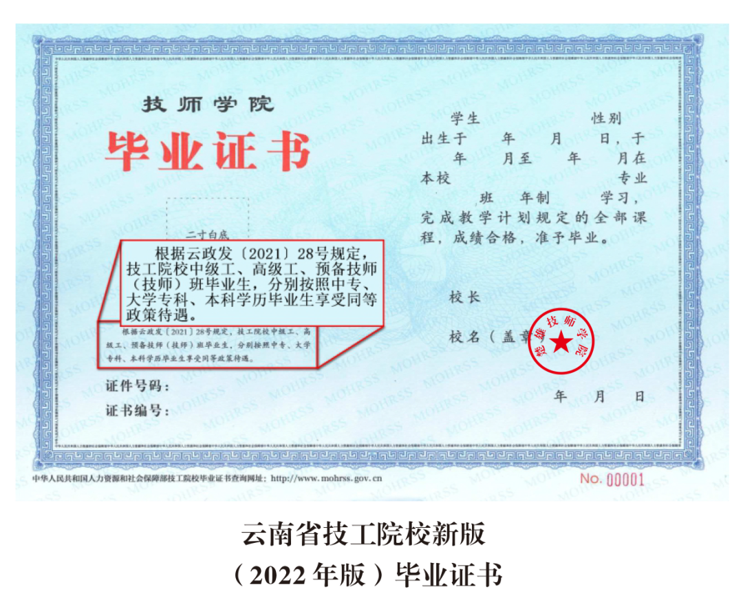 根據(jù)云南省政府關(guān)于實施“技能云南”行動的意見(云政發(fā)【2021】28號)文件精神,高級工、預(yù)備技師(技師)班畢業(yè)生在應(yīng)征入伍、就業(yè)、確定工資起點標準、參加機關(guān)事業(yè)單位招聘、職稱評審、職級晉升等方面,分別按照大學(xué)???、本科學(xué)歷畢業(yè)生落實政策待遇。