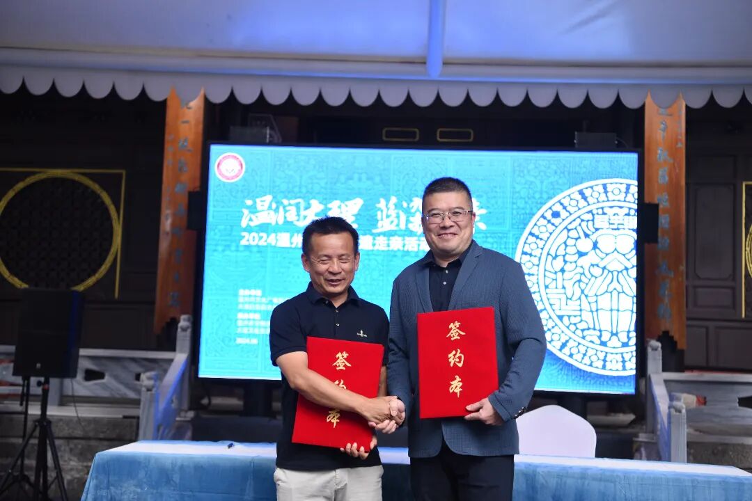 開幕儀式上,雙方領(lǐng)導為兩地傳承人戴上友誼的絲巾,為兩地非遺繁榮與發(fā)展開啟新篇章;溫州市非物質(zhì)文化遺產(chǎn)保護中心主任金盾、大理文化生態(tài)保護區(qū)保護發(fā)展中心主任趙向軍簽署非遺合作協(xié)議,為兩地非物質(zhì)文化遺產(chǎn)保護工作邁出嶄新的一步;溫州市文化廣電旅游局非遺處處長王曉靜、大理州文化和旅游局非遺科科長吉玲交換兩地非遺城市禮。