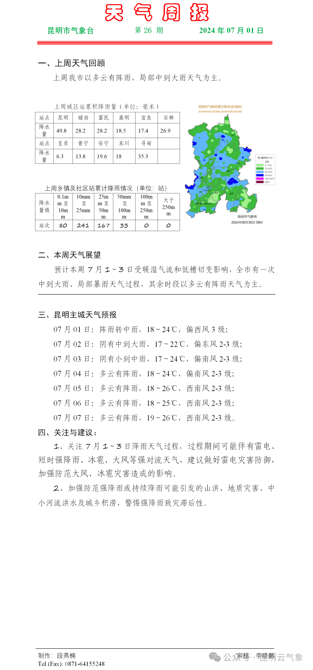 據(jù)昆明市氣象臺(tái)今天(7月1日)發(fā)布的天氣周報(bào),預(yù)計(jì)本周7月1日至3日受暖濕氣流和低槽切變影響,全市有一次中到大雨、局部暴雨天氣過程,其余時(shí)段以多云有陣雨天氣為主。