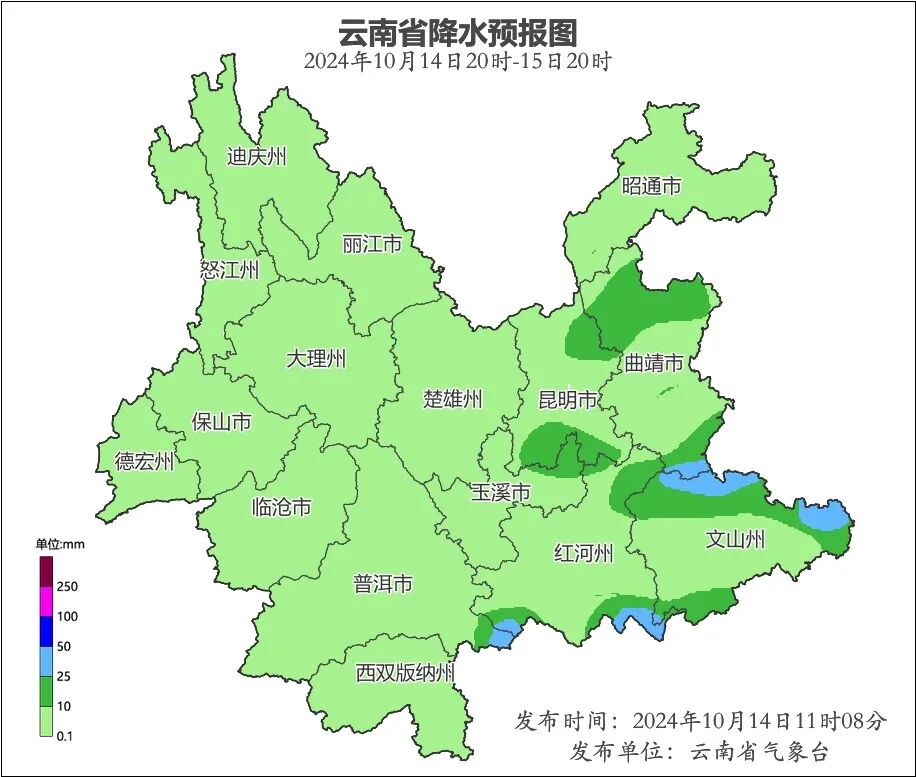 預(yù)計(jì)本周,我省無大范圍降溫降水天氣,大部地區(qū)以晴到多云天氣為主,東部和南部有小到中雨局部大雨、暴雨。其中,10月14日曲靖市、文山州北部、紅河州北部、昆明市東南部有中雨局部大雨、暴雨;15-16日昭通市、曲靖市、昆明市、玉溪市、文山州、紅河州、普洱市、西雙版納州、臨滄市有小到中雨局部大雨;20日昭通市、曲靖市、昆明市、文山州北部有小到中雨局部大雨。周內(nèi)東部和南部地區(qū)有雷暴、局地短時(shí)強(qiáng)降水等強(qiáng)對流天氣。