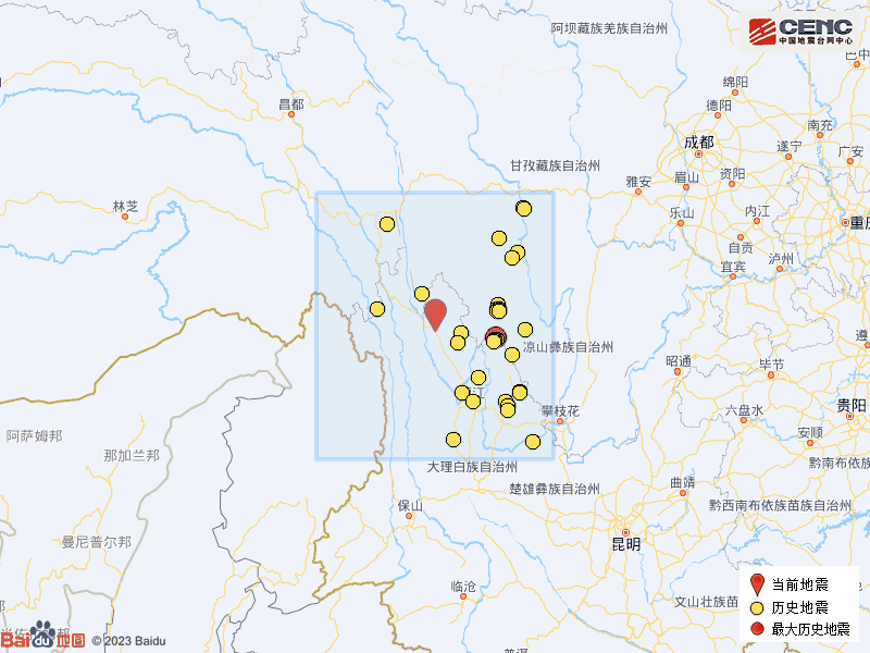 歷史地震:根據(jù)中國地震臺(tái)網(wǎng)速報(bào)目錄,震中周邊200公里內(nèi)近5年來發(fā)生3級(jí)以上地震共47次,最大地震是2022年1月2日在云南麗江市寧蒗縣發(fā)生的5.5級(jí)地震(距離本次震中106公里),歷史地震分布如圖。