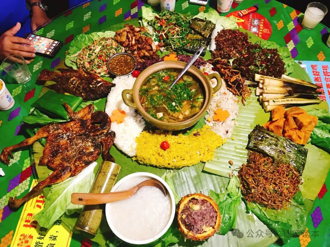 綠葉宴展現(xiàn)德宏的飲食習(xí)慣,用綠葉和青竹做餐具,追求原始的風(fēng)味,十分具有特色。綠葉宴上佳肴種類豐富,有竹筒烤魚、舂鱔魚、炸豬皮、鬼雞、卷米線等,給你的味蕾帶來一次前所未有的體驗(yàn)。