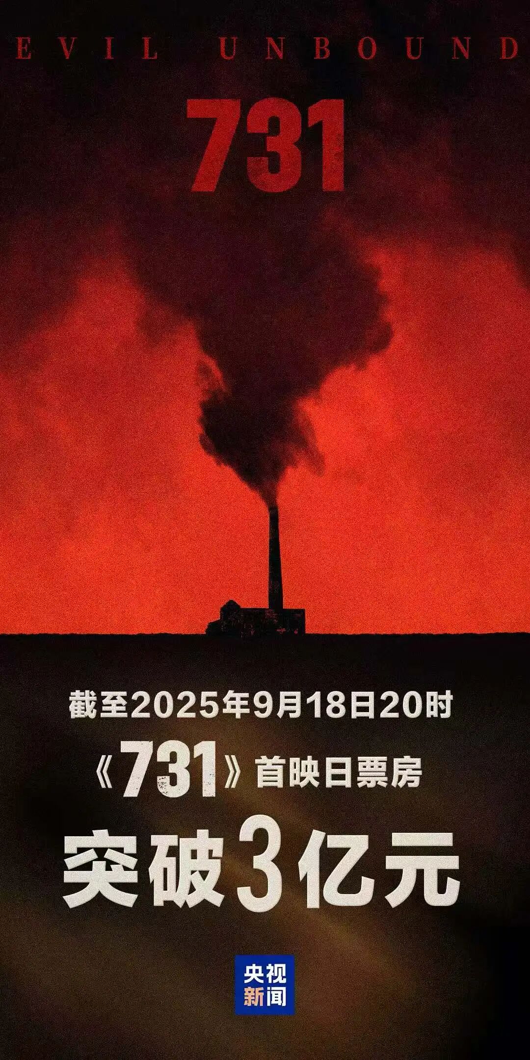 9月18日,電影《731》在全球多地上映。據(jù)網(wǎng)絡(luò)平臺(tái)數(shù)據(jù),截至9月18日20時(shí),電影《731》首日電影票房超3億元,總票房(含預(yù)售)超4.03億元,9月18日單日?qǐng)龃纹?6.9萬場,成中國影史單片單日總場次冠軍。(來源:央視新聞、新華社)
