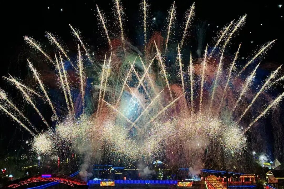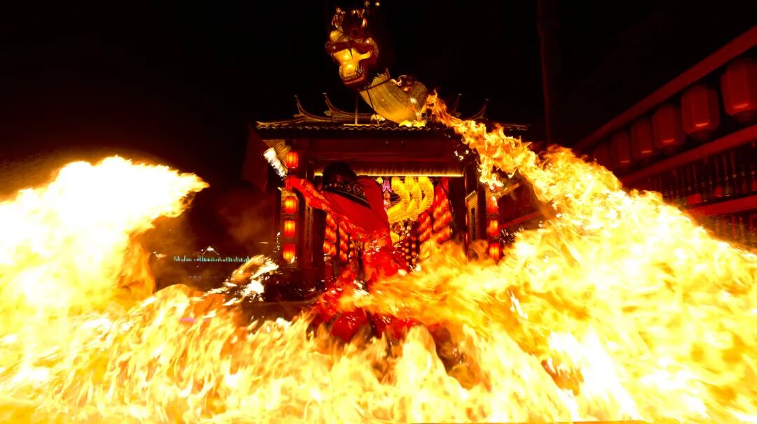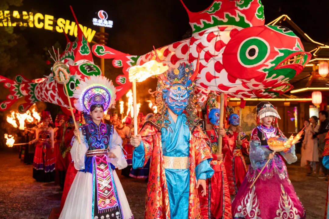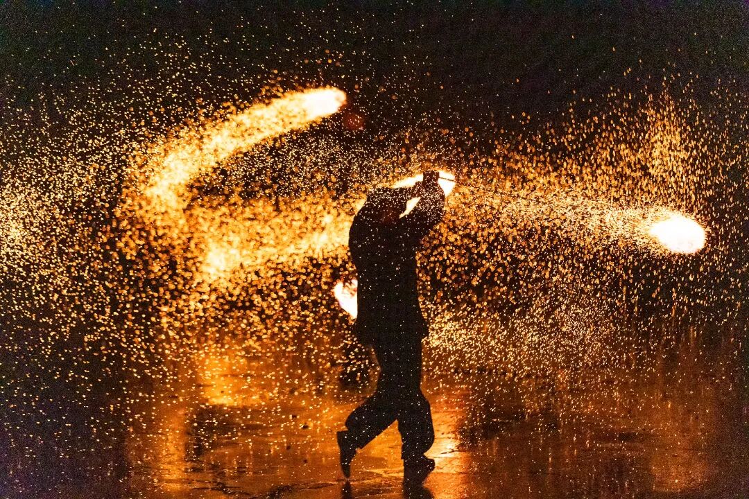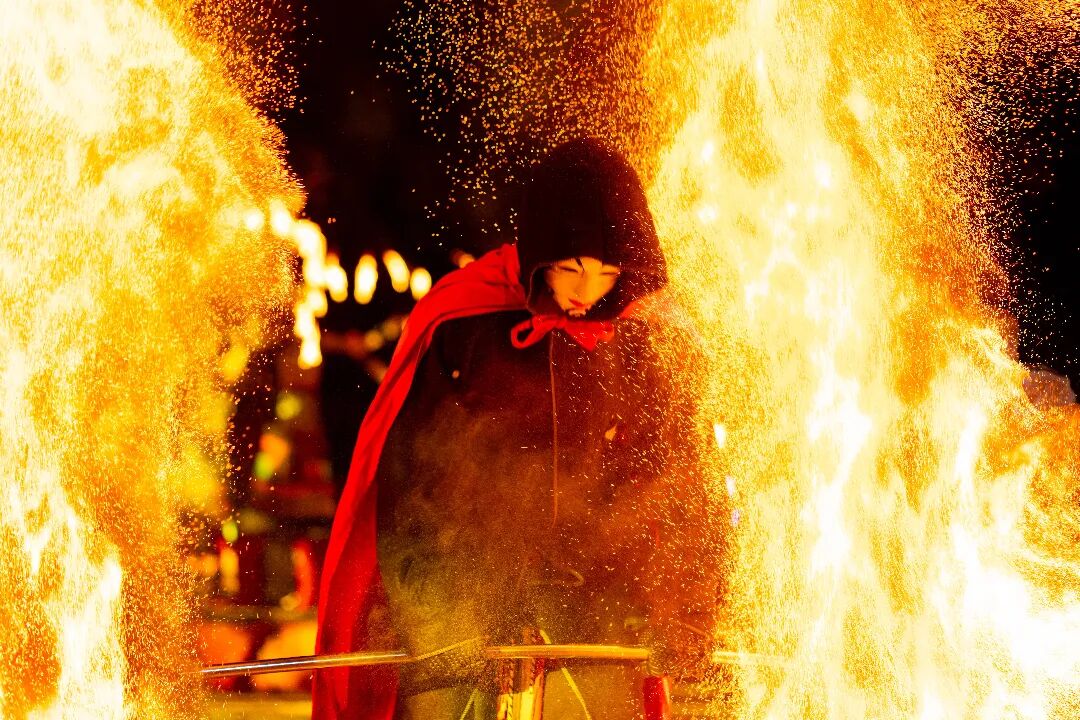 馭火奇技、鐵花潑空,火人狂歡盛宴燃出千般焰色?;鹉Х斤w旋火星四濺,火刀裂空長焰如龍,火壺流光燃燒千年一夢……匯聚各種非遺絕技的火秀奇觀,讓游客們目眩神迷。
