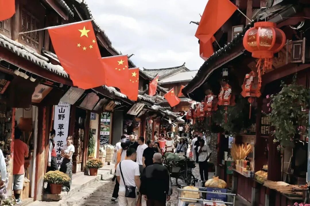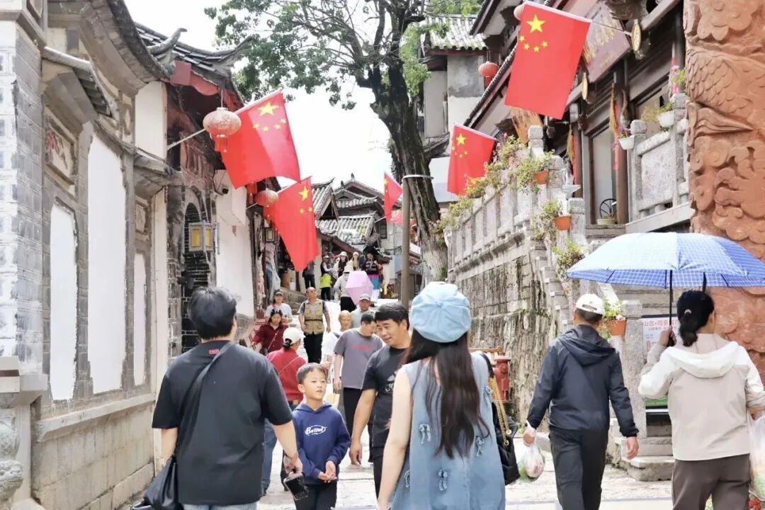 節(jié)日期間,麗江古城內(nèi)金秋菊影搖曳生姿,五星紅旗迎風(fēng)招展,與納西傳統(tǒng)民居交相輝映。大水車旁、四方街邊、木府牌坊前,那一抹抹耀眼的“中國紅”被游客朋友定格于鏡頭之中,1200面五星紅旗,讓“中國紅”成為古城最鮮明的底色。