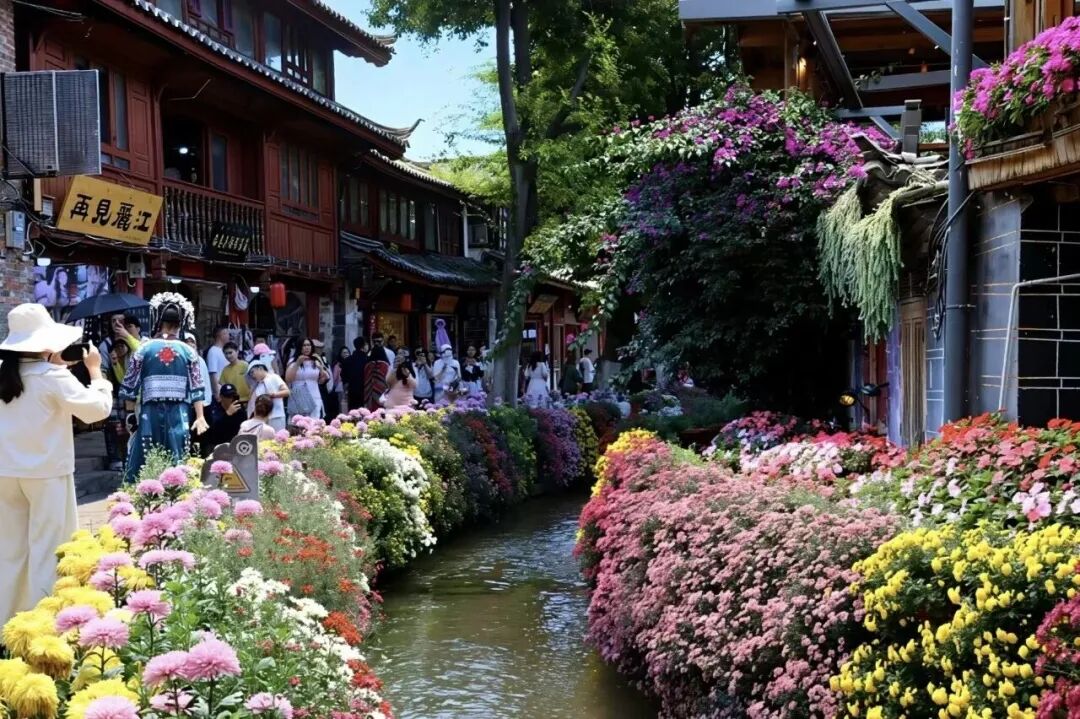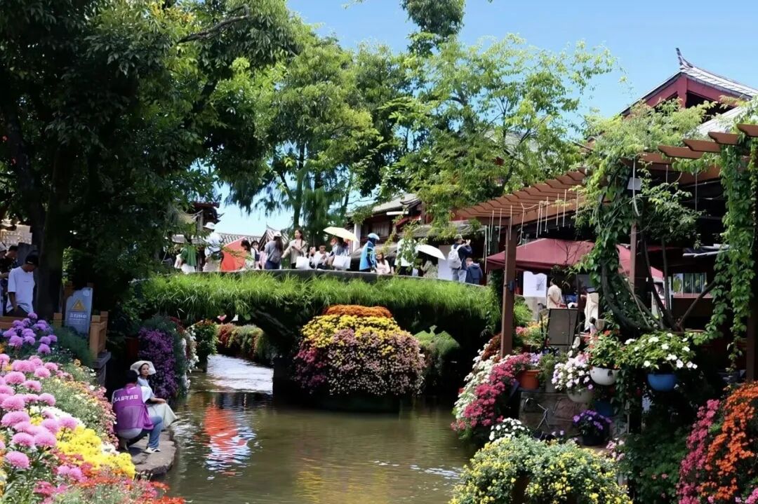 古城內(nèi)布置了3萬余盆菊花,涵蓋400多個品種,色彩斑斕、形態(tài)萬千,“舍不得的麗江”“和和美美”“慶豐收”“平安喜樂”等10組主題花卉造景錯落有致,令人流連忘返。