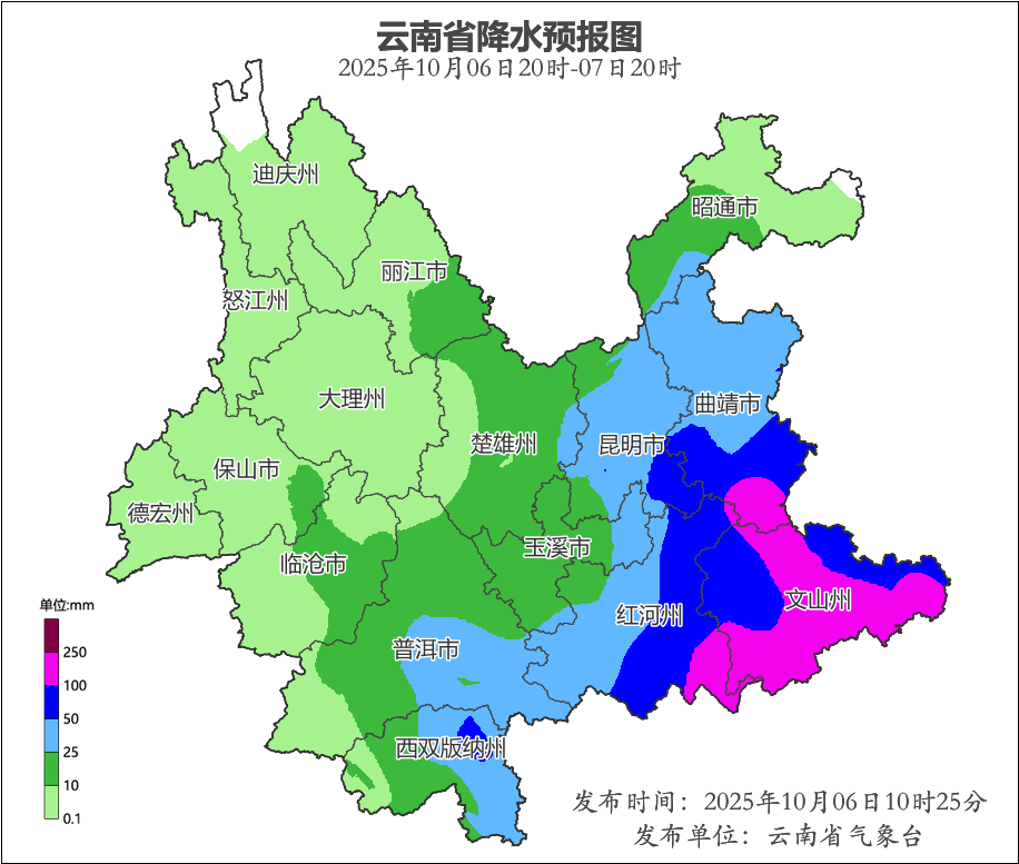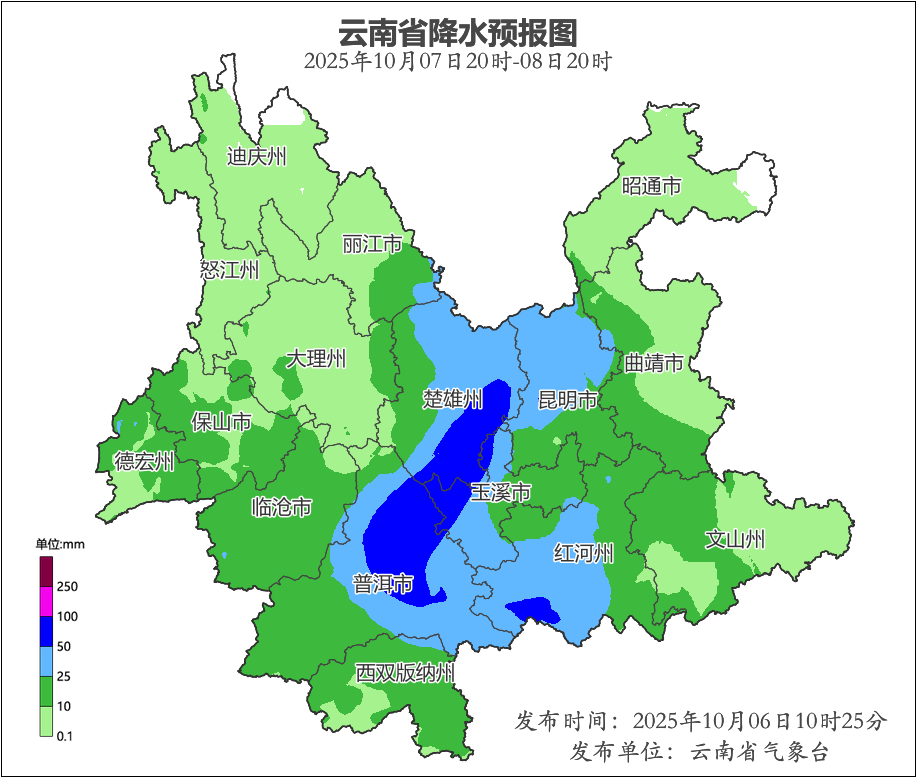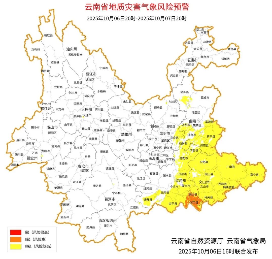 2025年10月06日20:00至10月07日20:00,曲靖市羅平縣、師宗縣,紅河州開(kāi)遠(yuǎn)市、蒙自市、屏邊縣、河口縣、金平縣,文山州文山市、硯山縣、丘北縣、廣南縣、富寧縣、麻栗坡縣、西疇縣、馬關(guān)縣發(fā)生滑坡泥石流的風(fēng)險(xiǎn)高;昆明市北部、東南部,曲靖市北部、南部,保山市南部,紅河州東北部至南部,文山州大部,普洱市東部,大理州中部,德宏州東部發(fā)生滑坡泥石流的風(fēng)險(xiǎn)較高。