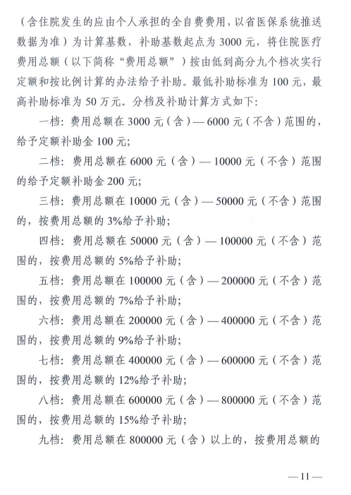 補助標準以參加活動人員住院費用總額為基數(shù),補助基數(shù)起點為3000元,按九個檔次給予補助,最低補助標準100元,最高補助標準50萬元。