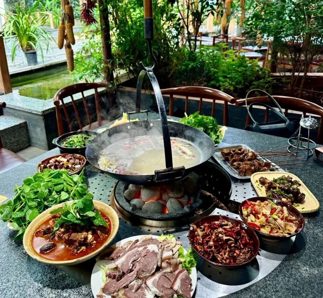 納西銅鍋正對著火塘燒!臘排骨、酥肉、洋芋層層碼滿,炭火越烤越鮮,你們“默契配合”拼完勝負(fù),火塘邊圍坐一圈,不分你我涮著吃,剛才的“邊路突破”“中場絞殺”,邊吃邊嘮越嘮越投機。