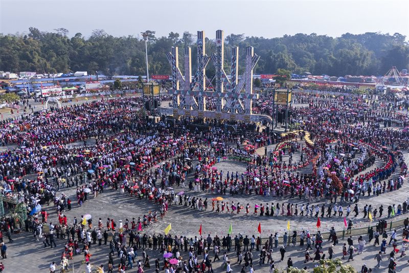 如今的德宏,各族文化在這里交織,共融成一首極具風(fēng)情的交響曲。每年年初,目瑙縱歌在這里起舞,各族群眾身披五彩盛裝,伴著鏗鏘鼓點(diǎn)和激昂铓鑼,在“瑙雙”“瑙巴”帶領(lǐng)下形成一支連綿不絕的舞隊(duì),男子長刀銀光閃爍,女子彩扇蝶舞翩躚,場面震撼壯觀。作為景頗族最為隆重的傳統(tǒng)民族節(jié)日,參與人數(shù)少則上千,多時(shí)過萬,場面壯觀,故而又被稱為“萬人之舞”。